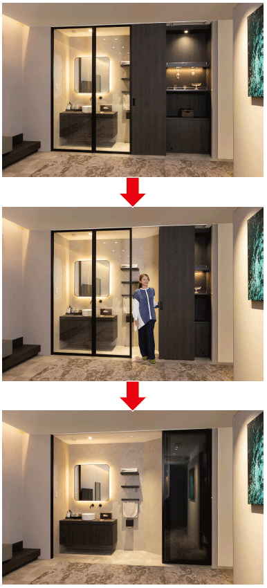 アルミフレームにガラスを組み合わせたハイエンドの移動間仕切り「liberte(リベルテ)」。写真は「平行収納マルチソフトクローズ」タイプ