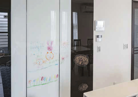 住宅建材でも高付加価値が求められる中、デザイン性で大きな差別化を図れる商品がウチヤマコーポレーションの「プリュムエイル」だ。表面にガラスを使用した建具の中でも、同社が培った貼り合わせ技術で高いクオリティを達成している。そのひとつが端部までの鏡面仕上げだ。余計な枠がないことから、より洗練された空間が実現できる。また、木基材と貼り合わせて切断する独自設備は、1年以上を開発に費やしたという。小口の仕上げやパネルの端部にまで気を配り、高いデザイン性を実現した同商品は、展示会に出展した際にも本物のガラスにしか出せない映り込みの美しさが好評を得たという。内装空間の価値を高める素材として、新たな選択肢となりそうだ。