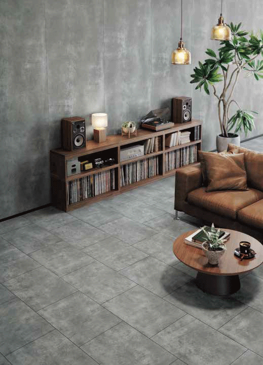 非木質のデザインをリビング空間にも取り入れられるように開発されたのが、非木質意匠フローリングの「コンカーボ」だ。モチーフとした素材をリアルに表現することにこだわった。第1弾としてモルタル、セラミック柄などを発売し、高い評価を得た。第2弾では人気の高いストーン系の柄を拡充し、ラインナップの魅力を高めた。表面シートを印刷メーカーと共同開発し、特殊な加工技術でリアルな意匠を追求したうえ、455mmの大判サイズで素材感を際立たせ、他社商品との差別化を図っている。