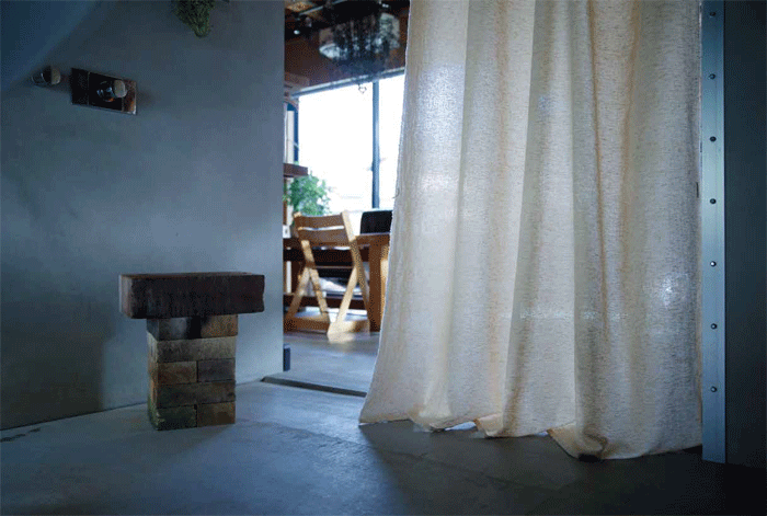 カーテンを中心としたホームファッション商品の企画・製造・販売を行うカズマが展開するブランド「KURASIKU(クラシク)」の自然素材100%のカーテン「madomo」は、素材に和紙や大麻(おおあさ)、竹などを使用している。OEM製品をつくっていた経緯から、ものづくりの体制を生かして自社製品開発に踏み切るなかで、消費者のナチュラル志向の高まりに注目。自然素材の風合いを大切にし、一つとして同じものが出来上がらないラフさを楽しむことをコンセプトにしている。原材料加工から、販売まで一貫して自社で行い、すべての工程にこだわりながら生地づくりに取り組んでいる。自然素材のため洗濯によって5%~10%の寸法変化が起こることもあるが、寸法の課題には、カーテン本体とレールを繋ぐパーツで長さ調節ができるように工夫している。染色には柿渋など天然染めにも挑戦し、柔らかい色合いになっている。