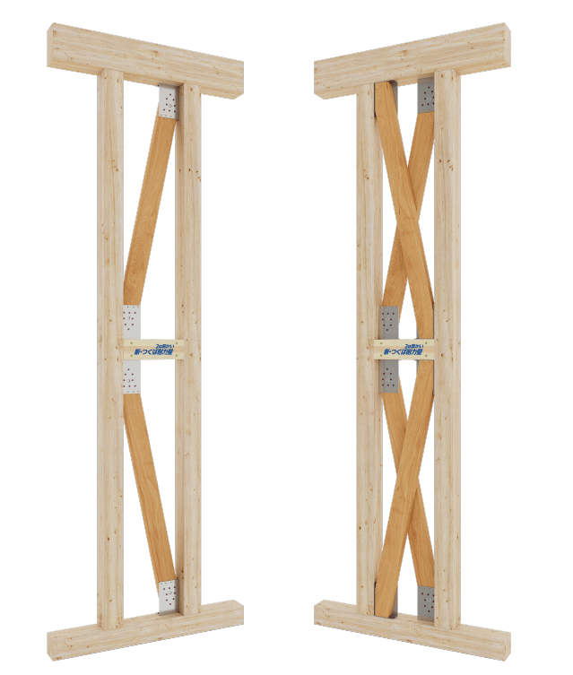 2024年には、かねてより要望の多かった、より高耐力で、狭小壁に対応した筋かい耐力壁が欲しいというユーザーの声に応え、「新・つくば耐力壁〈X型〉」を追加した。筋かいのみで相当壁倍率6.3倍~7.0倍(1mあたり)の耐力を確保することができる。構造用面材を張ることが難しい室内壁への使用に最適だ。