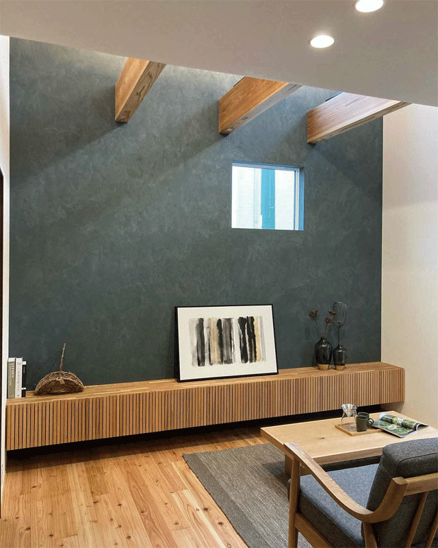 「MURA WALL(ムラ ウォール)」は、他にはない高い意匠性を簡易な施工で実現する内装用塗材。ソフトな色彩から重厚なコンクリート風の濃色まで、様々なシーンにマッチするカラーを取り揃える。