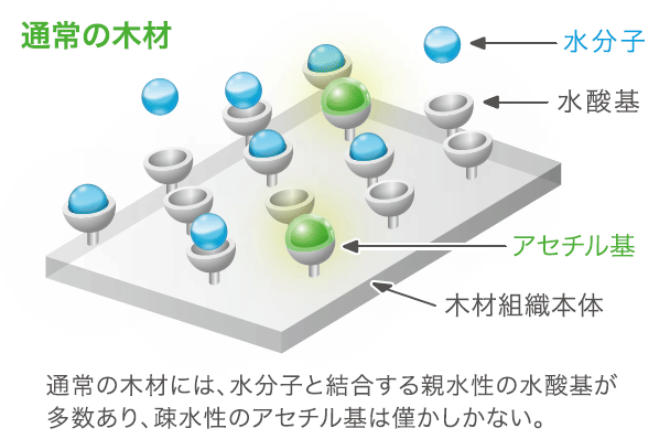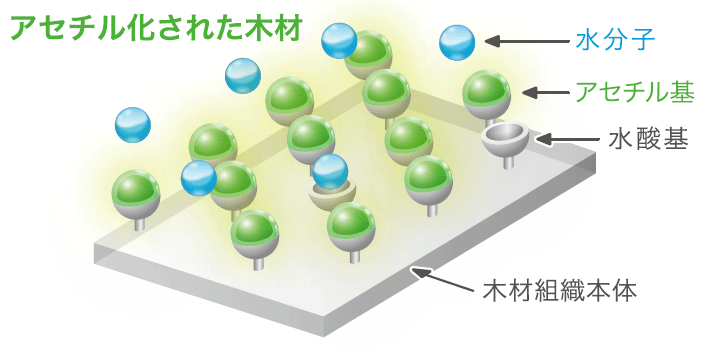 アセチル化木材は、優れた防腐性能と防蟻性能、また、寸法安定性を持つ。地上50年、地中・淡水中で25年の対腐朽菌耐用年数がメーカー保証されている。さらに、もともと木材の中に存在しない物質が含まれないため安全性も担保された新しい機能性木材といえる。アセチル化後も優しい質感、自然の風合いといった木ならではの特長はそのまま。他の木材と同じように自由に塗装ができ、加工を行うこともできる。