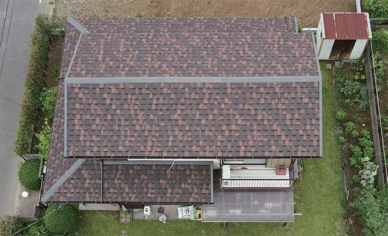 アスファルトシングル材は、シングル材に石粒を接着したもので、主に北米の住宅で広く採用されている。石粒の色によりさまざまな色合いを表現できる意匠性、シート状でカッターで切断できる施工性や扱いやすさ、軽さなどが特徴だ。田島ルーフィングのアスファルトシングル材は、シングル材にあらかじめ工場で接着剤を塗布する「プレセメント加工」により、施工者による品質のばらつきがなく、自然災害にも強いことが大きな特長。そのアスファルトシングル材の葺き足(屋根材の一枚の長さから葺き重ねることによって隠された部分を引いた長さ)を既存化粧スレートと同じ182mmと大型化したのが「OHVAN」。かぶせ工法の屋根改修で使用しやすくした。