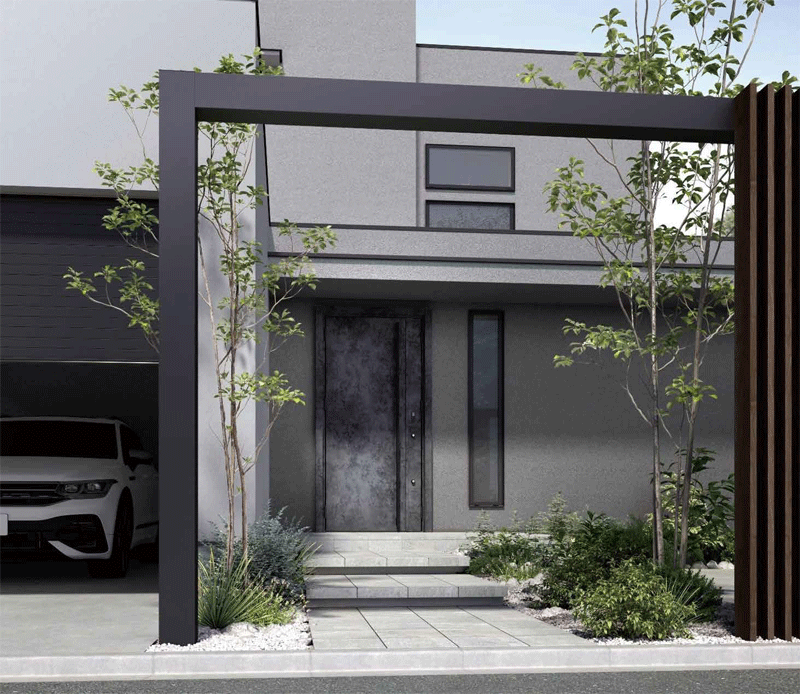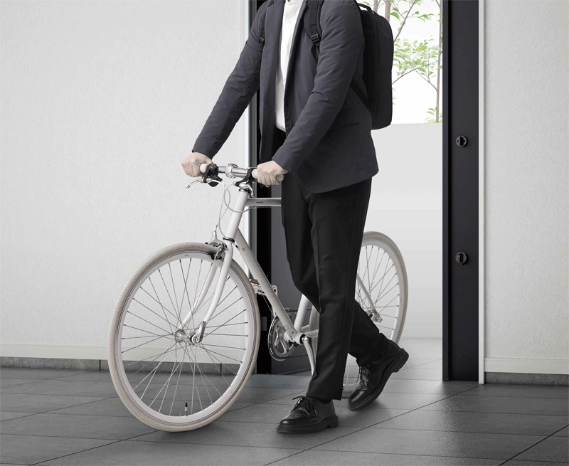 錠やラッチのパーツを子扉(機能ユニット)に納めることで、一味違う玄関ドアのデザイン提案を可能にしたのが、「玄関ドア XE」だ。これまでの玄関ドアは、錠やラッチ、電気錠デバイスなどを扉の戸先に配置する構造が一般的であった。しかし「玄関ドア XE」は、ハンドルとラッチを分離して、すべての機能パーツを子扉に納め、ハンドルとの連動ではなく扉を押す・引くの動作でラッチが出入りするローラーラッチを採用した。これにより、ハンドルとラッチを連動させていたために、ハンドルの意匠や位置に制約があった従来の玄関ドアでは不可能だったシンプルで美しいドアデザインを実現する。