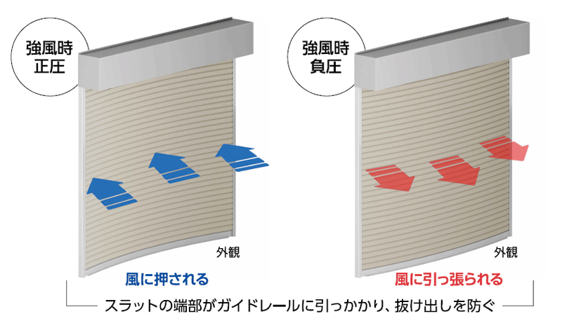 「耐風ガードLS」では強風時にシャッターカーテンがガイドレールから外れる被害に対し、耐風圧性能を高め、耐風圧性能800Pa( 正圧・負圧とも)を実現した。強風でシャッターがたわむと、スラット端部がガイドレールに引っかかる独自のフック構造を採用しており、シャッターを閉鎖するだけで高い耐風圧性能を発揮し、ガイドレールからスラットが抜け出すことを防止する。