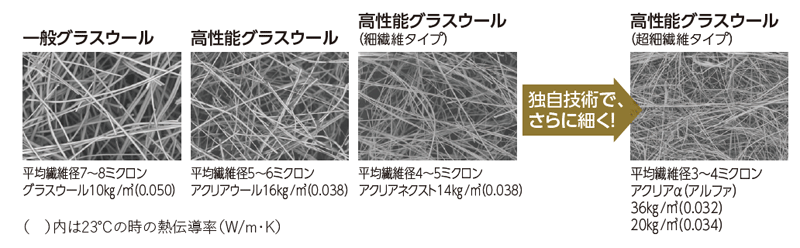 グラスウール断熱材は、ガラス繊維が絡み合い空気を内包し、内部の空気の移動を抑えることで断熱性能を発揮する。繊維が細いほどその本数が増え、空気が移動しにくくなることから、同じ密度でも高い断熱性能を発揮する。